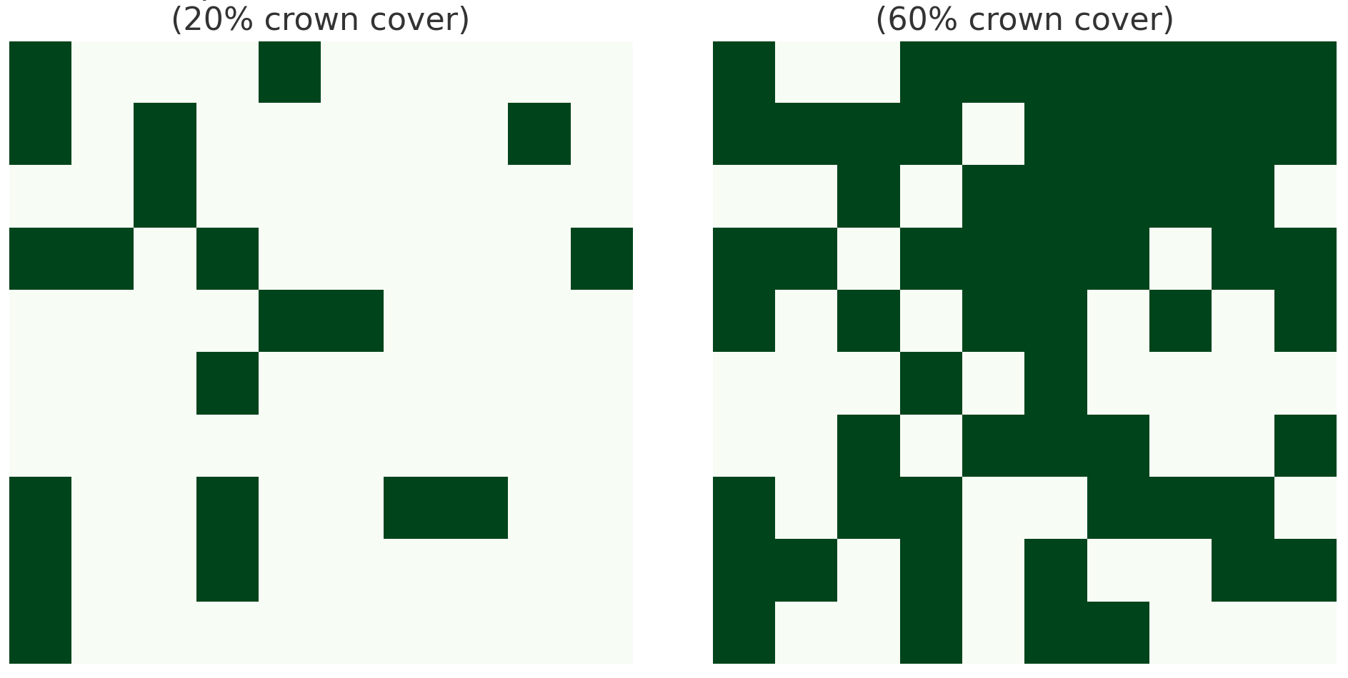 So 20% is really only sparsely covered land. Here’s a simple visual comparing 20% crown cover (sparser, more open land) with 60% crown cover (denser, forest-like).