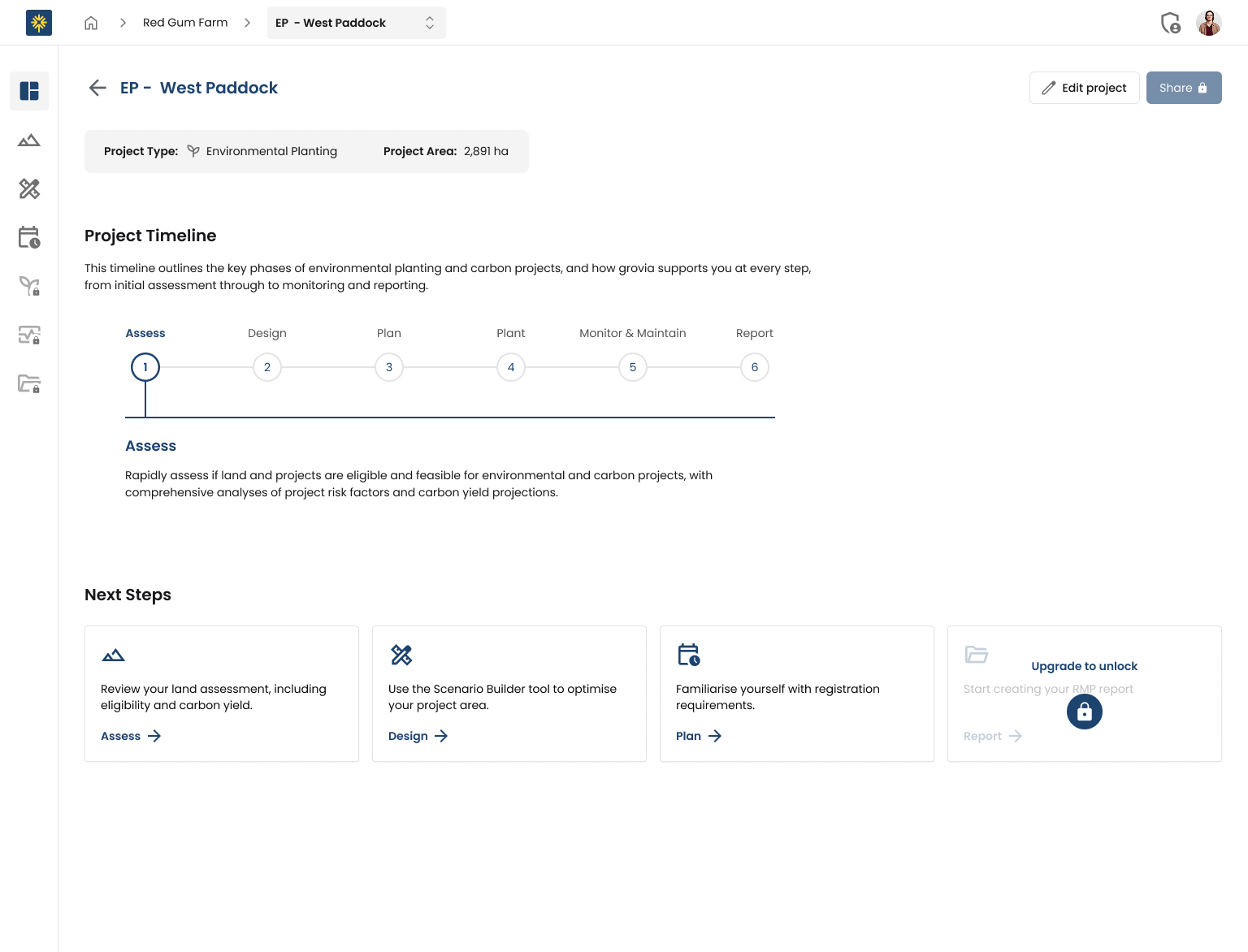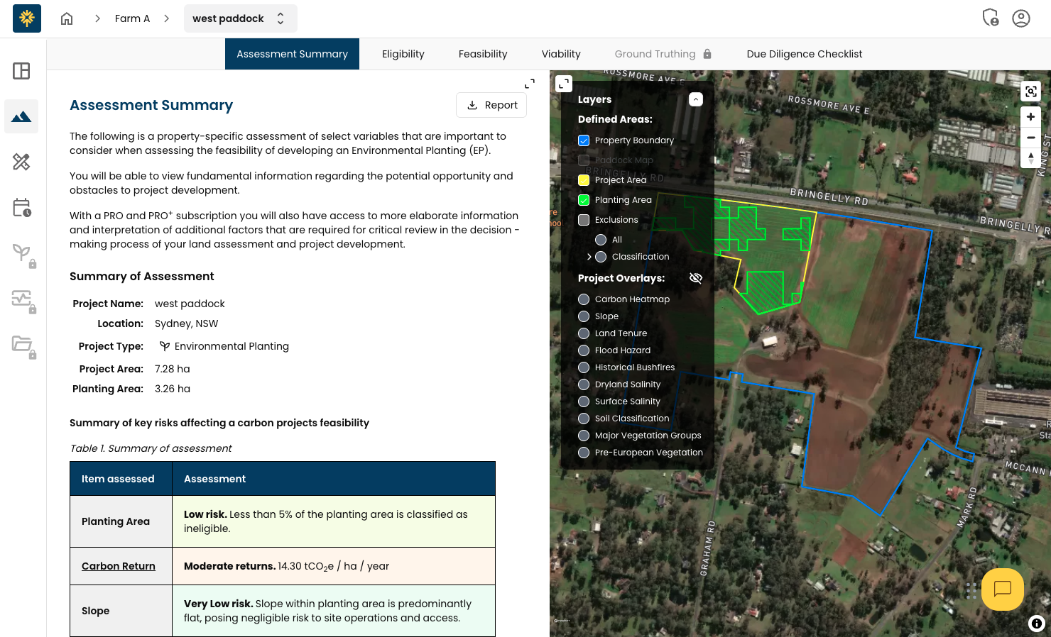 Select the project (or property) to navigate to your Project Hub. Access the Assess module to view your land assessment results.