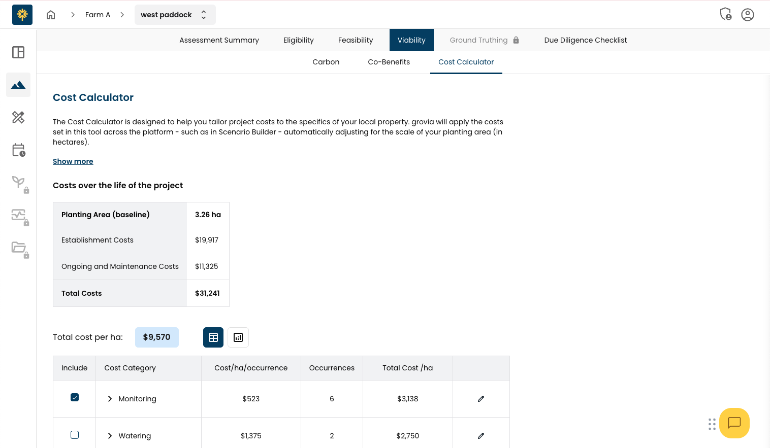 The cost calculator is now under 'viability' within the Assess module, where it sits alongside carbon yield and co-benefits to give you a complete picture of your project's financial position.
