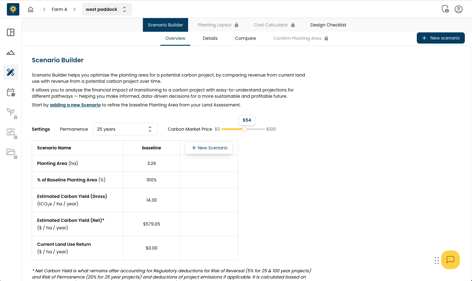 Scenario Builder is now in the Design module, where you can explore different project layouts and compare potential carbon yield against current land use revenue to find the optimal configuration.